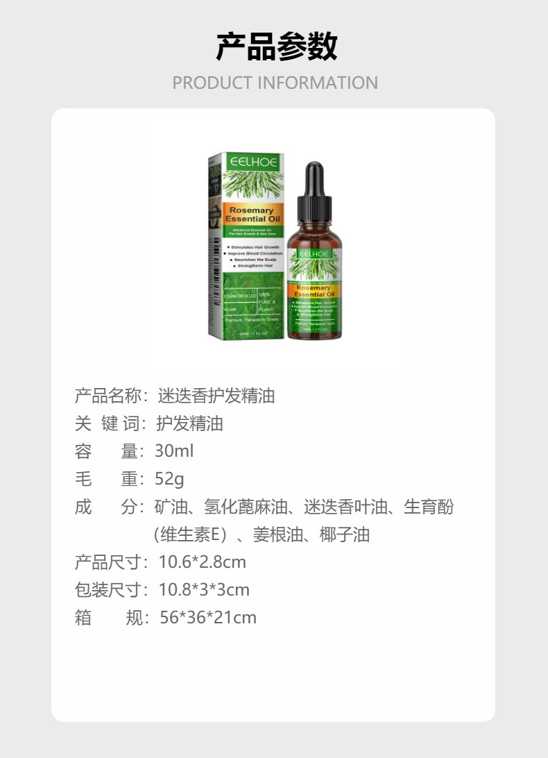 Name: Rosemary Essentiall Oil Net Content: 30ml Shelf Life: Three Years Storage Method: Store in a cool and dry place Scope of Application: Hair care, hair growth Gross Weight: about 52g